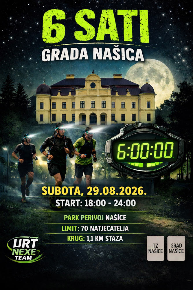 U subotu 29. kolovoza 2026. godine, grad Našice ponovno postaje središte sportske energije i rekreacije. U organizaciji URT NEXE TEAM Našice, TZ Našice i Grada Našica u prekrasnom ambijentu Perivoja i dvorca Pejačević, održat će se u drugom izdanju utrka „6 sati grada Našica“. Riječ je o šestosatnoj kružnoj utrci koja započinje u 18:00 sati, a traje do ponoći. Staza je duga 1,1 kilometar, a sudionici imaju jedan jasan cilj – u 6 sati prijeći što više kilometara, bez obzira na to trče li, kombiniraju trčanje i hodanje ili nastupaju rekreativno. Ova utrka nije rezervirana samo za iskusne trkače. Naprotiv – dobrodošli su rekreativci, zaljubljenici u kretanje, šetači i svi oni koji žele isprobati vlastite granice u ugodnoj i poticajnoj atmosferi. Svaki prijeđeni krug se broji, a svatko nastupa prema svojim mogućnostima. Posebnu čar utrci daje večernji i noćni termin, kada Perivoj Našice postaje jedinstvena sportska pozornica pod reflektorima i čeonim lampama, uz kulisu povijesnog dvorca. Broj sudionika je ograničen na 70 natjecatelja, stoga organizatori pozivaju sve zainteresirane da na vrijeme osiguraju svoje mjesto. Prijave su moguće na sljedećoj poveznici: