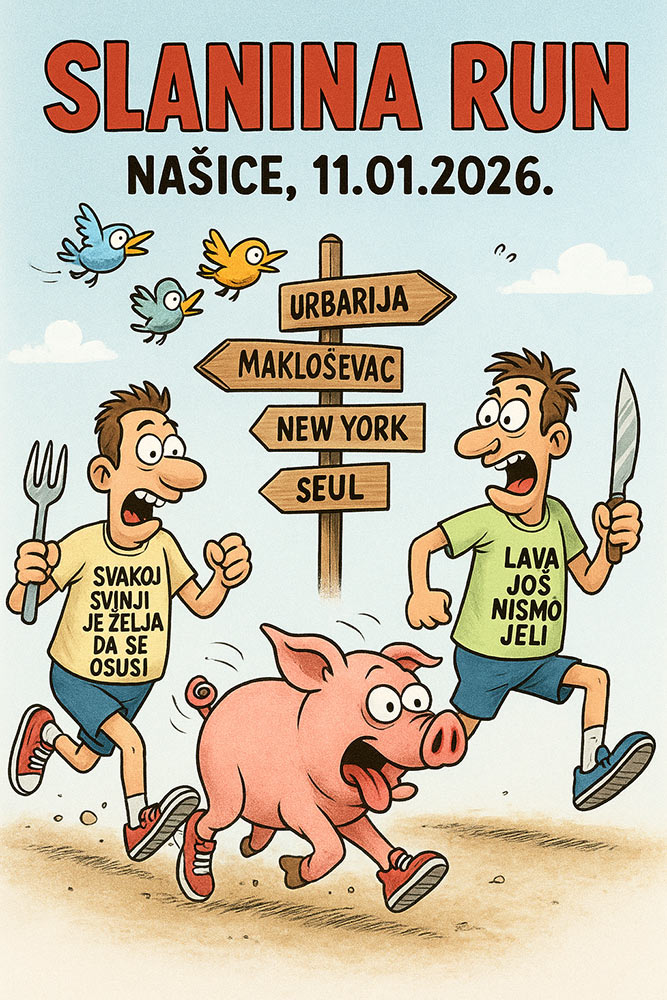 Pripremite se za najukusniju i najsmješniju sportsku avanturu! 11. siječnja 2026. u 10:00 sati, u naselju Urbarija, održat će se SLANINA RUN – prva sportsko rekreativni utrka u kojoj se snaga, brzina i izdržljivost stapaju s mirisom pečene slanine!